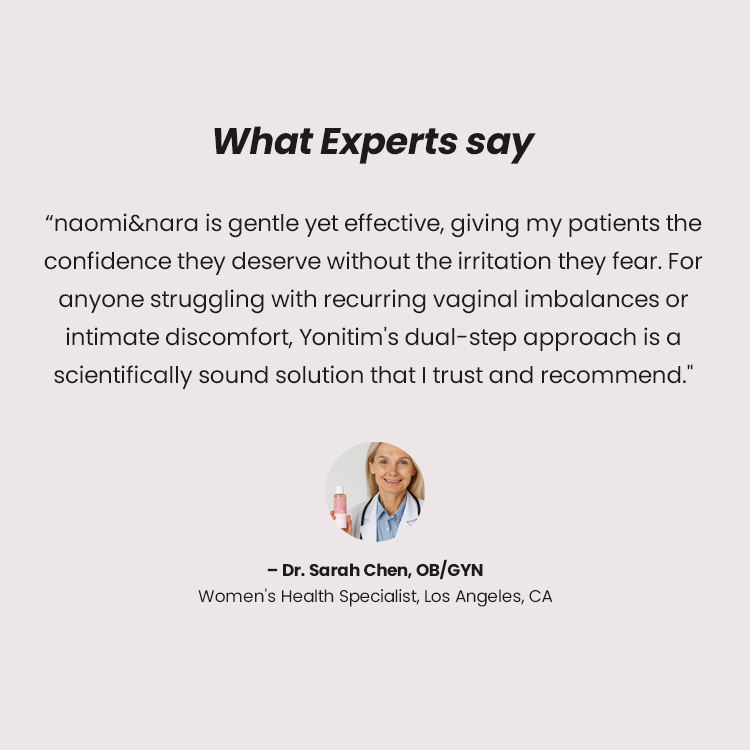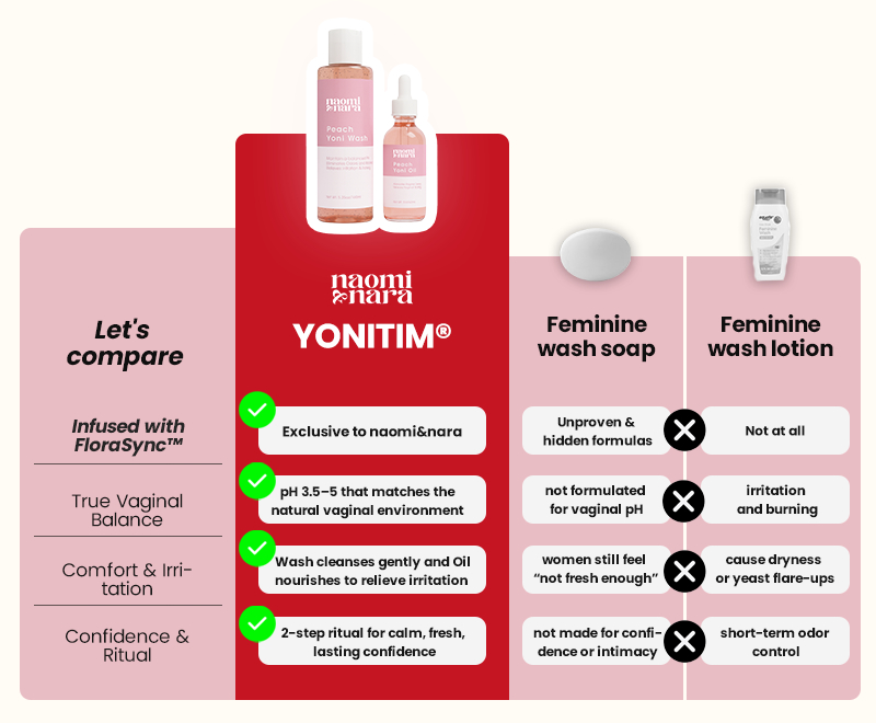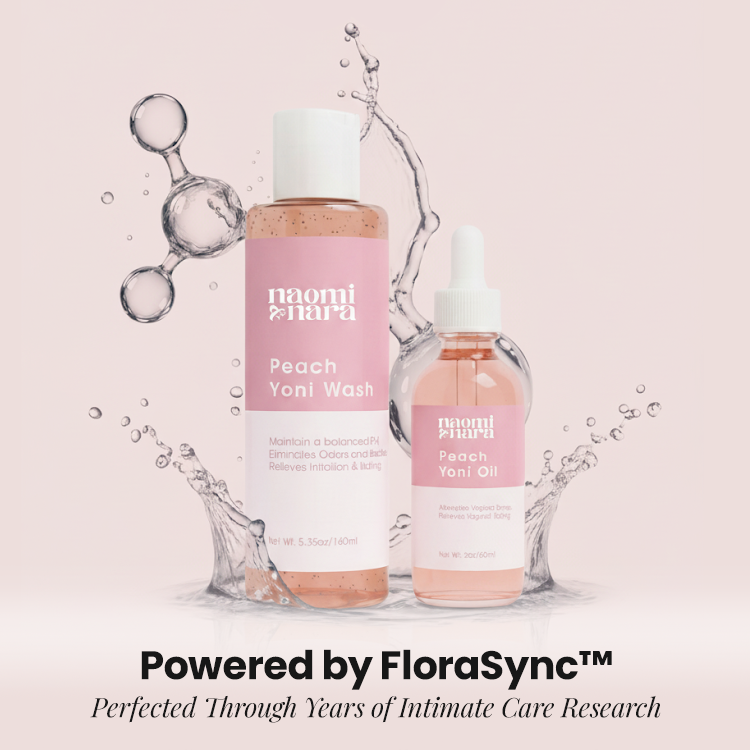 Unlike generic washes or soaps that strip, irritate, or just mask odor, Naomi & Nara’s patented FloraSync™ Technology is the world’s first dual-phase ritual engineered to actively synchronize your intimate pH, flora, and skin barrier in perfect harmony.